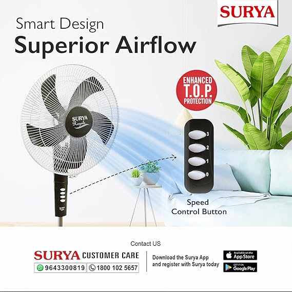 The Surya Roshni Royale 400mm Pedestal Fan combines elegant style with high performance. Featuring 5 aerodynamic blades, smooth 90° oscillation, and a powerful 63W copper motor, it delivers superior air circulation. Its double ball bearing and enhanced Thermal Overload Protection ensure durability, safety, and consistent comfort in every corner.