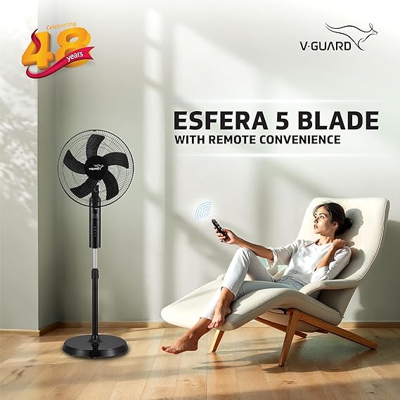 Experience cooling comfort with the V-Guard Esfera 5 Blade Pedestal Fan, designed for modern homes. It features a powerful 1300 RPM copper motor, remote control operation, and three speed modes for customized airflow. The energy-efficient CRNO lamination ensures optimal performance, while the stylish 5-blade design delivers quiet, high air delivery.